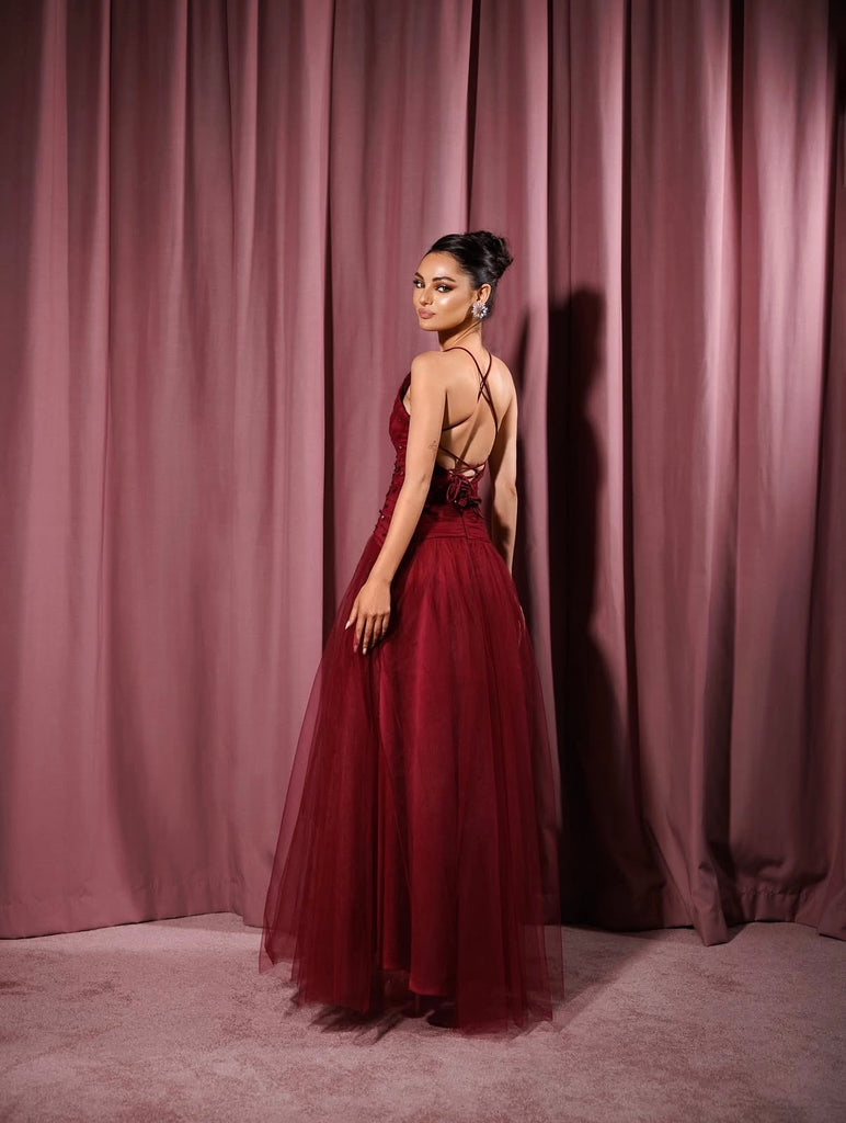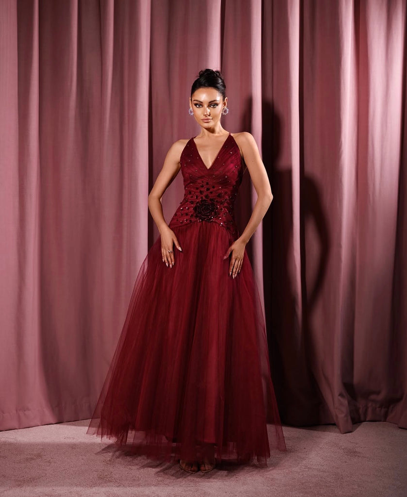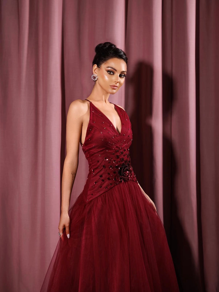 فستان من التول بلون خمري مزين بتلات مطرزة
