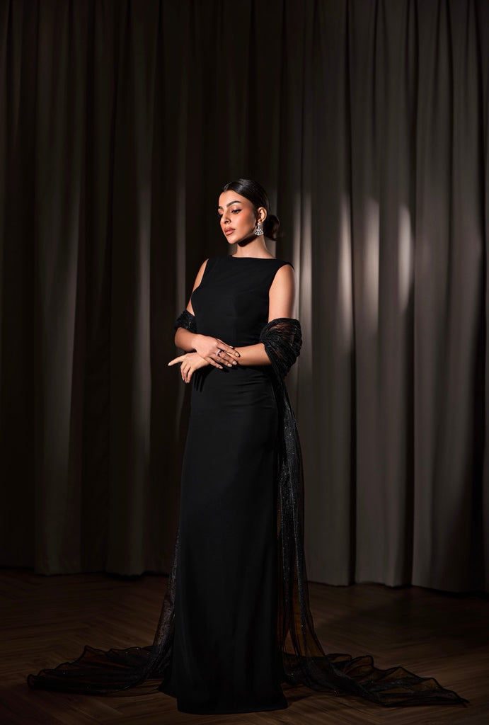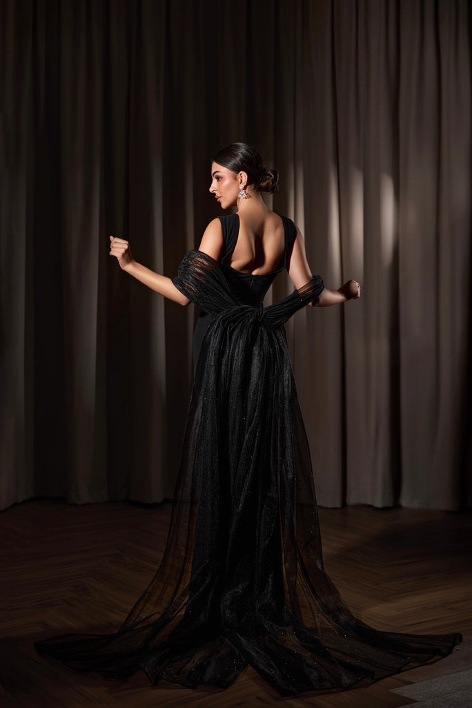 Black crepe dress with Shiny organza cape attached by sparkling crystals
